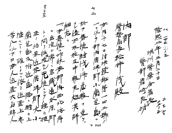 다음은 일제가 편찬한 『폭도에 관한 편책』 중 1908년 소난지도 선착장 전투기록으로 홍성경찰분서장 경부 이와사키 요시키[岩崎良材]가 경무국장 마츠이 시게루[松正茂]에게 보낸 보고서이다.