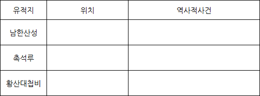 윗글에 나오는 ‘남한산성, 진주 촉석루, 운봉의 황산대첩비’는 이석용이 민족의식을 키우기 위해 다닌 유적지들이다. 각 유적지가 외세의 침략과 어떤 관계가 있는지 검색하여 아래 표를 작성해보자.