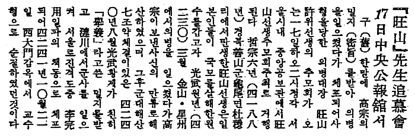「허위 판결문」, 대심원, 1908년 10월 3일. 『동아일보』, 1959년 10월 16일, 3면 10단,「왕산선생추도회」. 오세창,「민족운동사에서 본 왕산 허위의 위치」,『왕산허위의 사상과 구국의병항쟁』, 금오공과대학교 선주문화연구소, 1995, 86-90쪽. 김희곤 외,『왕산 허위의 나라사랑과 의병전쟁』, 구미시·안동대학교 박물관, 2005, 25·257쪽. |