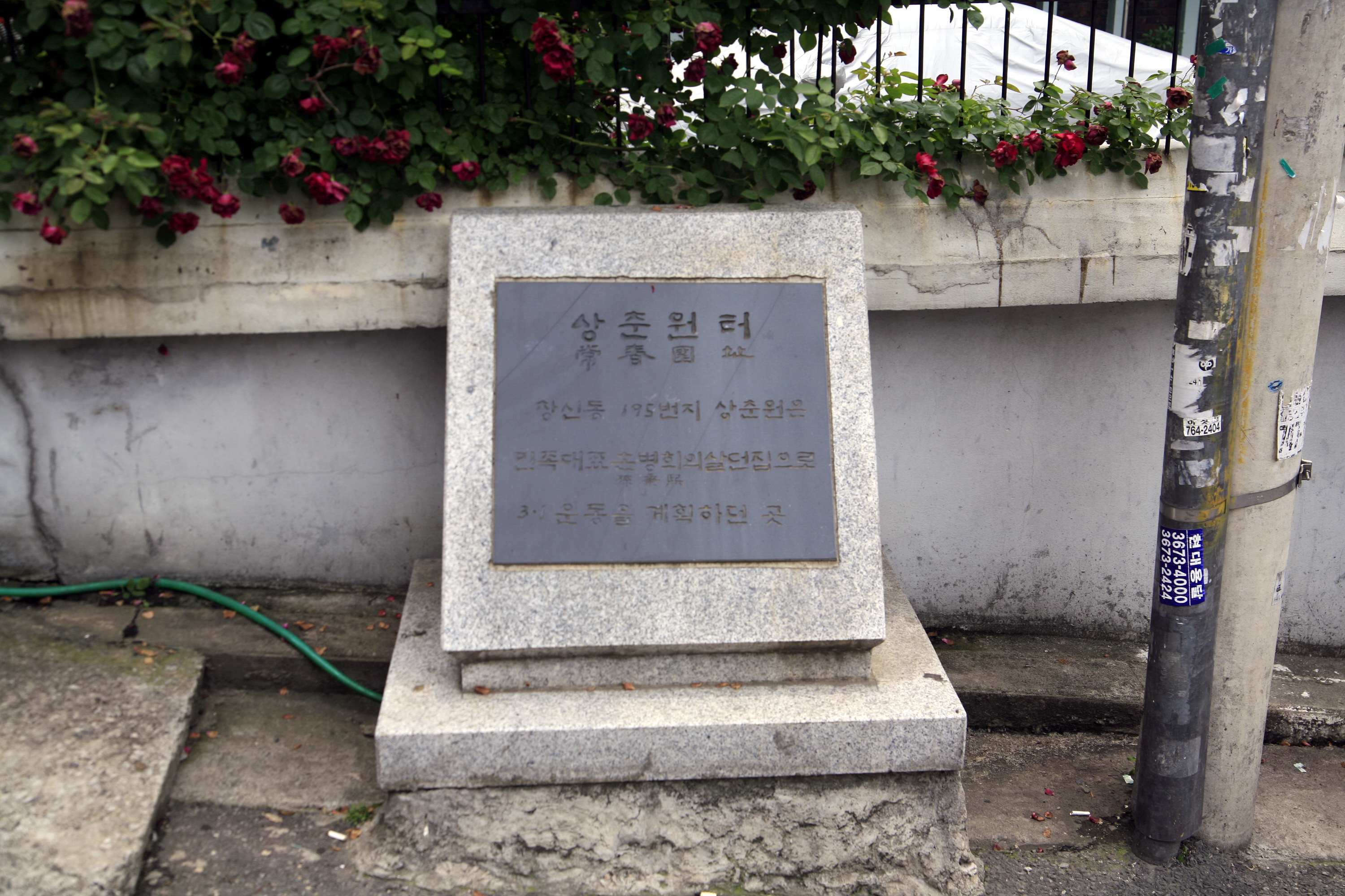 | 관련 내용 | 낙산 남동쪽 자락에 위치한 상춘원(常春園)은 1912년 천도교에서 매입해 천도교회의 3대 기념일 행사를 비롯한 각종 모임을 열던 곳으로, 교주 손병희가 별장으로 사용하기도 했다. 1919년 1월경 권동진·오세창·최린 등 천도교 지도부는 손병희가 머물던 상춘원에서 수차례 모임을 갖고, 파리강화회의 개최에 즈음한 국내·외 정세와 민족자결 원칙에 입각하여 대대적인 독립운동 계획을 논의하였다. 이 자리에서 손병희는 독립운동의 3대 원칙으로 대중화·일원화·비폭력의 방침을 제시했다. 상춘원은 3·1운동으로 옥고를 치르고 출옥한 손병희가 1922년 5월 19일 62세를 일기로 숨을 거둔 곳이기도 하다. |