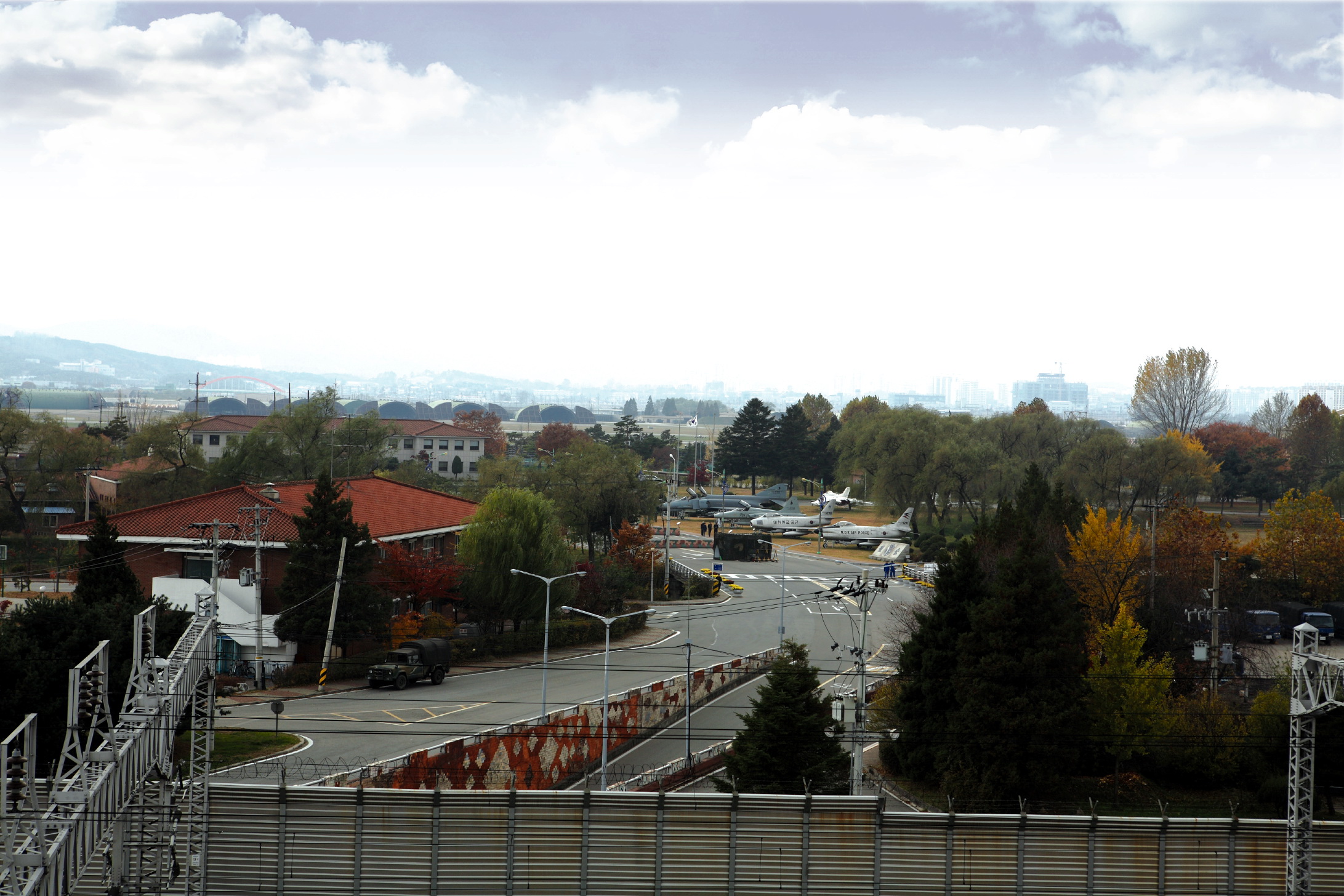 수원비행장 입구와 비행장 내에 전시된 퇴역 전투기