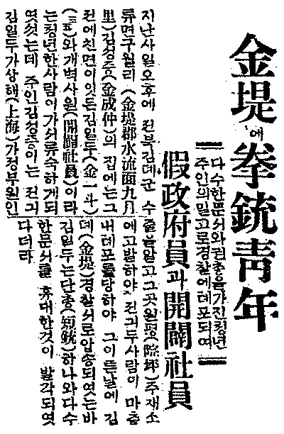 「김일두 공적조서」, 국가보훈처 공훈전자사료관. 「김진동 판결문」, 1921년 5월 6일, 국가보훈처 공훈전자사료관. 「김진동 판결문」, 1921년 6월 2일, 국가보훈처 공훈전자사료관. 『동아일보』, 1926년 7월 10일, 「金堤에 拳銃靑年, 가정부와 개벽사원」. 『신한민보』, 1926년 8월 12일, 「지리산에 군사를 두어 부호의 기부를 받아 갔다고」. |