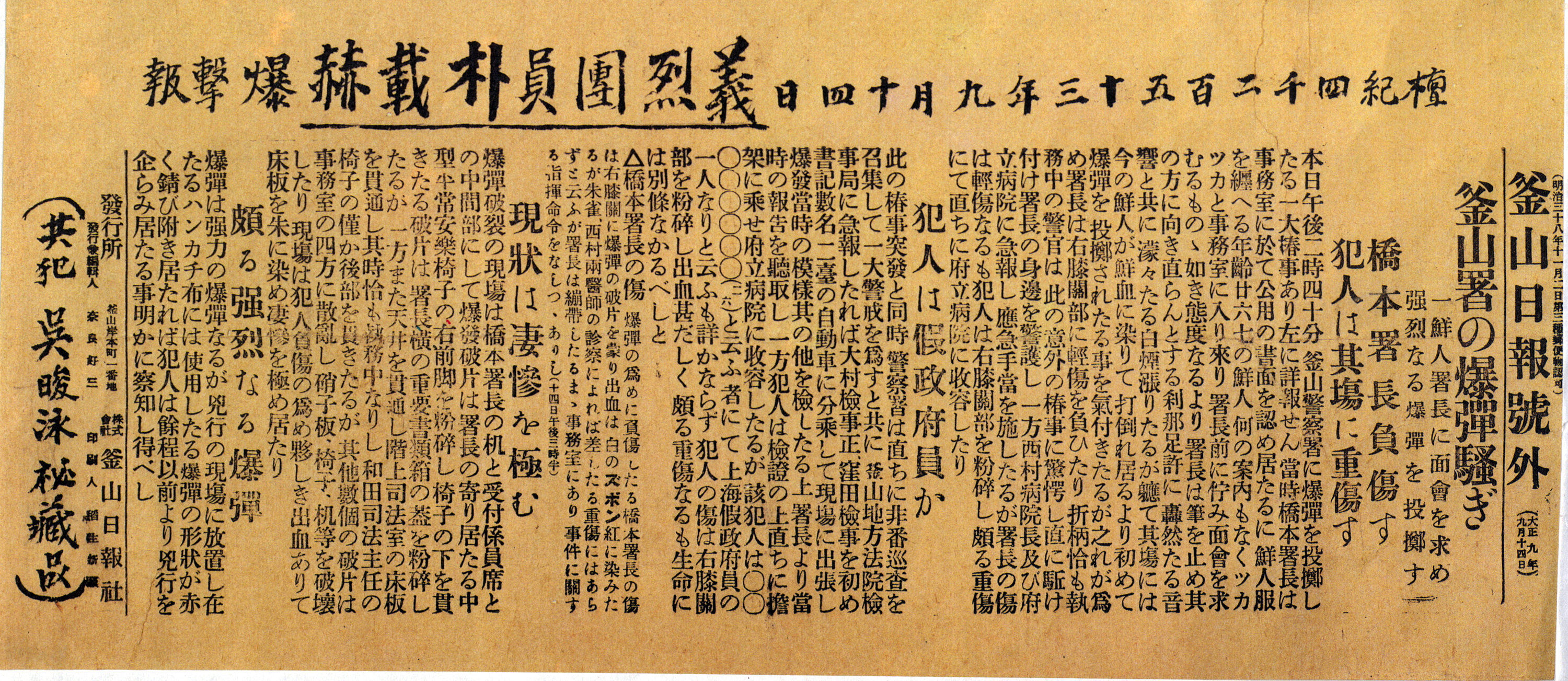 박재혁 의거 보도기사(『부산일보』호외, 1920년 9월 4일)