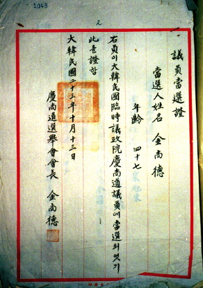 김상덕 임시의정원 의원 당선증(1941년 10월 13일)