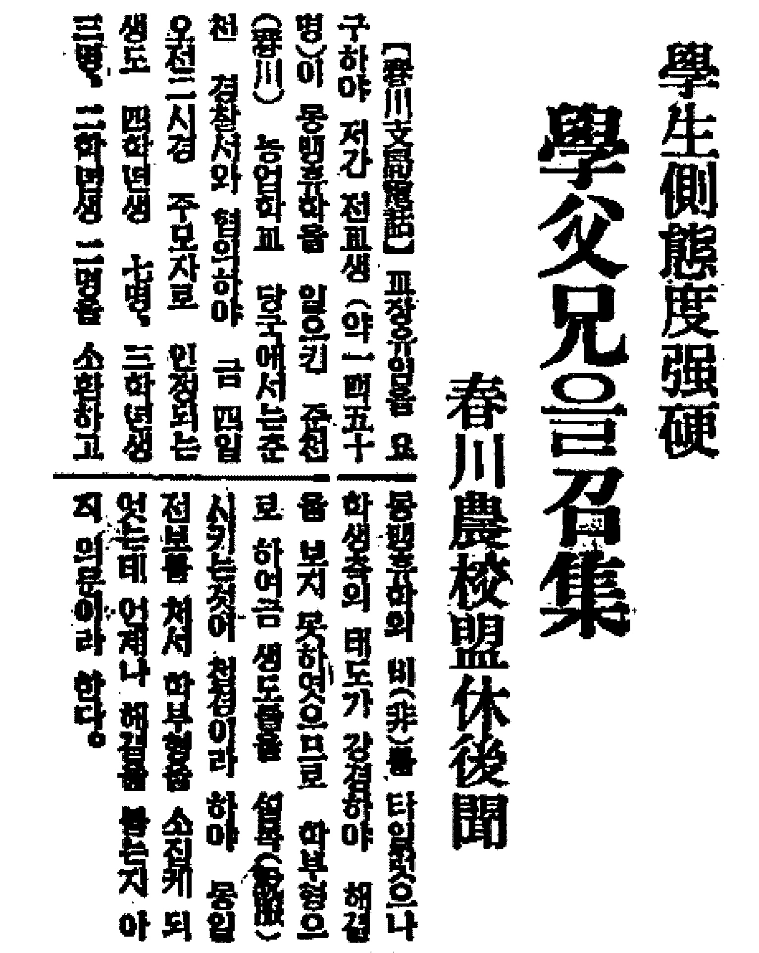 『조선일보』, 1937년 6월 3일, 「춘천농교맹휴사건 점차로 확대」. 『조선일보』, 1937년 6월 3일, 「진맹휴, 절간 농성」. 『동아일보』, 1937년 6월 5일, 「學生側態度 强硬 學父兄을 召集, 春川農校 盟休 後聞」. 『동아일보』, 1937년 6월 16일, 「春川農校 解決, 아직까지 無可望」. 『동아일보』, 1937년 6월 18일, 「春川農校 盟休, 아직도 解決못해」. 春川農業高等學校同窓會, 『春農七十午年의 脈絡 : 1910-1984』, 1984, 323~326쪽. 김흥수, 『춘천항일독립운동사』, 춘천문화원, 1999, 336~338쪽. |