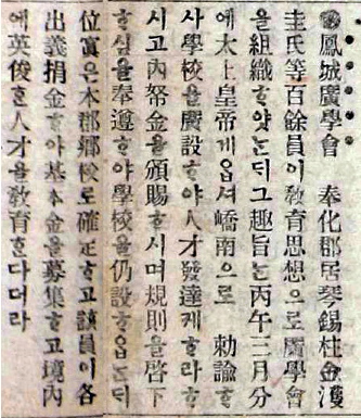 『황성신문』, 1908년 4월 19일, 「鳳城廣學會」. 김희곤 외,『봉화의 독립운동사』, 봉화군, 2007, 129쪽. |