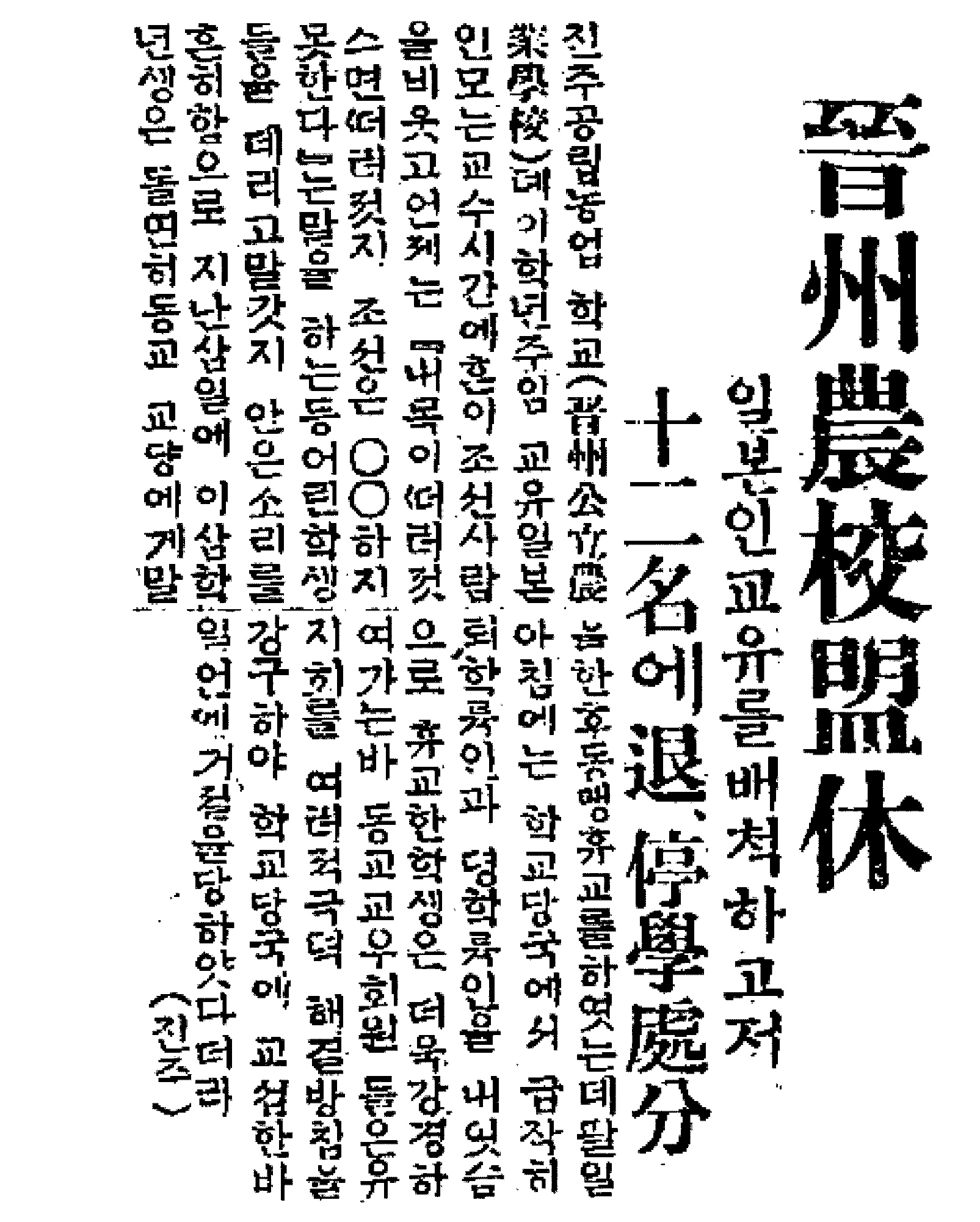1927년 6월 3일 진주공립농업학교 2학년 학생들은 일본인 담임교사 다카키[高木佐太郞]가 학생들에게 모욕과 극심한 차별대우를 행하는 데 대한 항의의 의미로 동맹휴학에 돌입하였다. 이에 대해 학교당국은 주도자 6명을 퇴학, 6명을 정학시키려 하였으나, 퇴학생을 무기정학으로 처리하면서 사태는 봉합되는 듯 했다. 그러나 1년 뒤인 1928년 7월 6일 진주공립농업학교 학생들은 진주고등보통학교 학생들과 연맹하여 '조일공학제(朝日共學制) 폐지, 노예 교육 철폐, 조선어 시간 연장, 조선역사 교수, 교내의 언론·집회의 자유 보장' 등을 내걸고 다시 동맹휴학에 들어갔다. 학교당국은 무기 휴교령을 내리고 학생 전원을 무기정학시켰으며, 진주공립농업학교에서는 15명을, 진주공립고등보통학교에서는 10명을 퇴학시켰다. 게다가 진주공립농업학교의 방화사건으로 퇴학생은 47명으로 불어났고 무기정학은 350명에 달하였다. 결국 9월 1일경 무기정학이 해제됨으로써 동맹휴학은 일단락되었다. 진주공립농업학교는 동맹휴업 외에도 3·1운동과 광주학생운동에도 적극적으로 호응하였고, 1920년 8월에는 천장절을 기하여 만세운동을 계획하였다가 발각되는 등 학생운동의 전통이 깊은 곳이다. 또 1931년 3월의 동반회(同伴會) 사건과 11월의 TK단 사건 등 비밀결사운동도 활발하였다. 진주공립농업학교는 1910년 4월 30일 진주공립실업학교라는 이름으로 옛 낙육재 터에 개교하였다. 1911년 11월 진주공립농업학교로 개칭하였고 1921년 5월 1일 진주군 진주면 천전리의 실습지 북쪽에 교사를 신축하고 이전하였다. 1931년 4월에는 진주군 진주읍 소화정 150번지로 다시 이전하였는데, 현재의 진주산업대학교 터이다. |