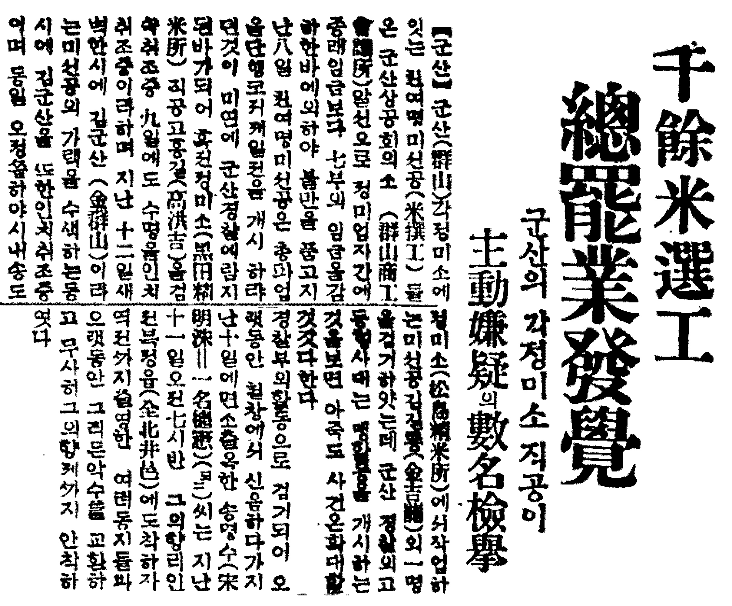 군산은 쌀 집산지로 많은 정미소가 있었다. 이들 정미소는 생산된 쌀을 곧바로 배에 실어 나를 수 있도록 철도변이나 항구 옆에 위치하였고, 그곳이 현재의 호남제분 끝에 집중적으로 자리하고 있어 이곳을 정미소거리라고 하였다. 1924년 당시 여기에서 일하는 발동기 기술자, 가마니운반 노동자, 무동력 정미소에서 매를 가는 매갈이 노동자, 쌀의 늬를 고르는 미선 여공 등 노동자가 남녀 2,000여 명에 이르렀다. 이들은 악조건에서 중노동을 했지만 임금은 갈수록 삭감되었고, 이에 대한 생존권투쟁은 1924년에서 1934년까지 계속되었다. 1924년 3월 군산 낙합(落合)정미소에서 노동자의 임금을 내리자 매갈이 인부 32명이 16일부터 동맹휴업에 들어갔다. 정미소에서 임금을 7전에서 점차 2전 8리로 내리자 동맹휴업을 단행한 것이다. 1926년 11월에는 군산정미소 직공 1,000여 명이, 1928년 1월에는 중정정미소 직공이, 1930년 2월에는 남선정미소 직공 36명이, 동년 10월에는 육석정미소 직공 100여 명과 흑전정미소 직공 88명이 파업을 단행하였다. 급기야 12월에는 1,000여 명의 미선공(米選工)이 파업을 계획한 비밀집회가 발각되어 주동자 2명이 체포되는 사건을 맞이하게 되었다. 1934년 1월에는 가등정미소 여직공 100여 명이 임금문제로 파업에 들어갔다. |