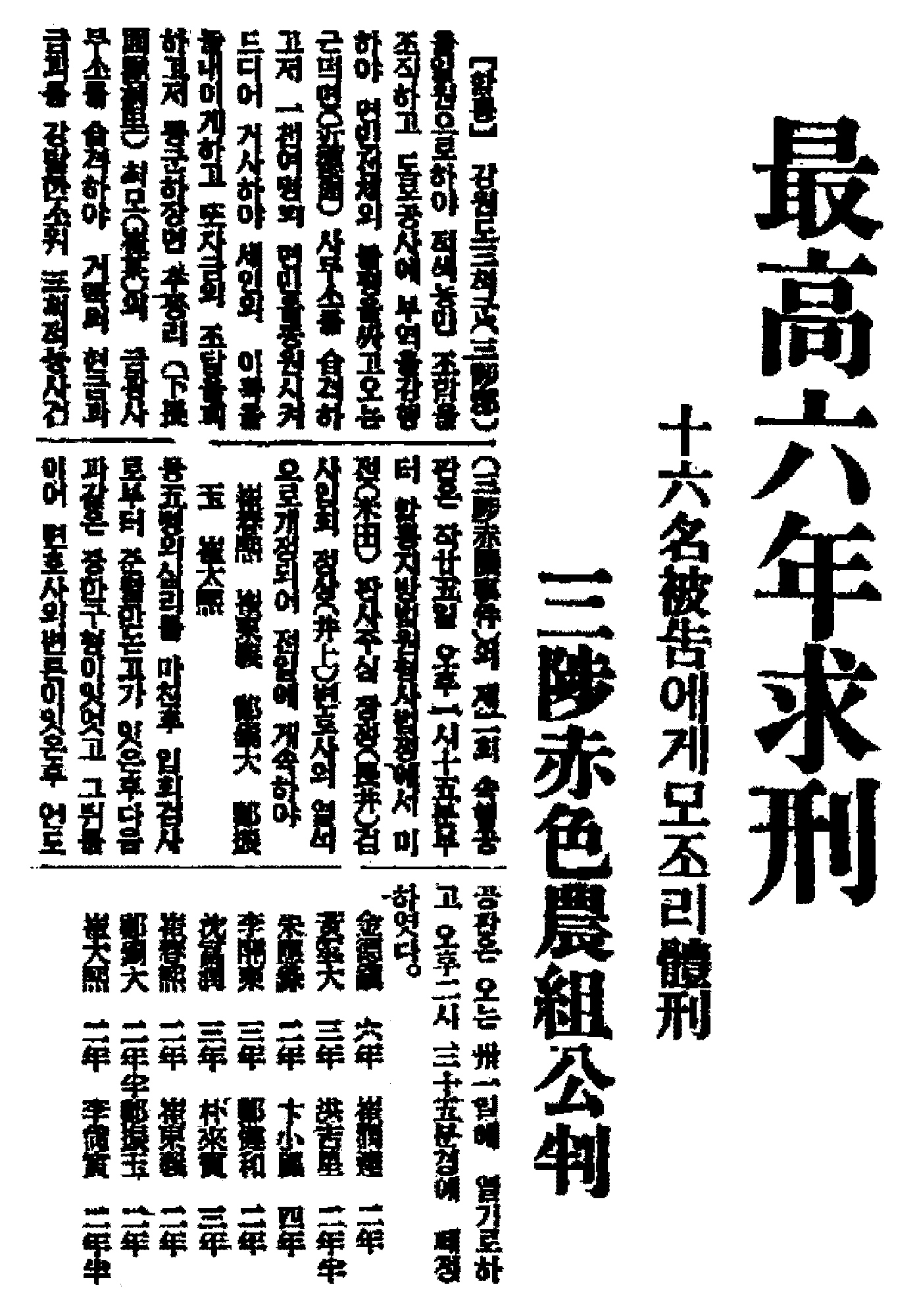 『동아일보』, 1935년 9월 4일, 「三陟赤色農組 豫終 十六名 有罪決定, 治維法違反 暴力行爲 等으로 咸興法院 公判에 廻附」. 『동아일보』, 1935년 10월 27일, 「最高 六年 求刑 十六名 被告에게 모조리 體刑, 三陟赤色農組 公判」. 독립운동사편찬위원회,『독립운동사자료집』14, 1978, 790∼797쪽. 김점숙,「1920-1930년대 영동지역 사회운동」,『역사와현실』9, 1992, 295∼298쪽. 조성운,『 일제하 농촌사회와 농민운동 - 영동지방을 중심으로』, 혜안, 2002, 99∼108쪽. |