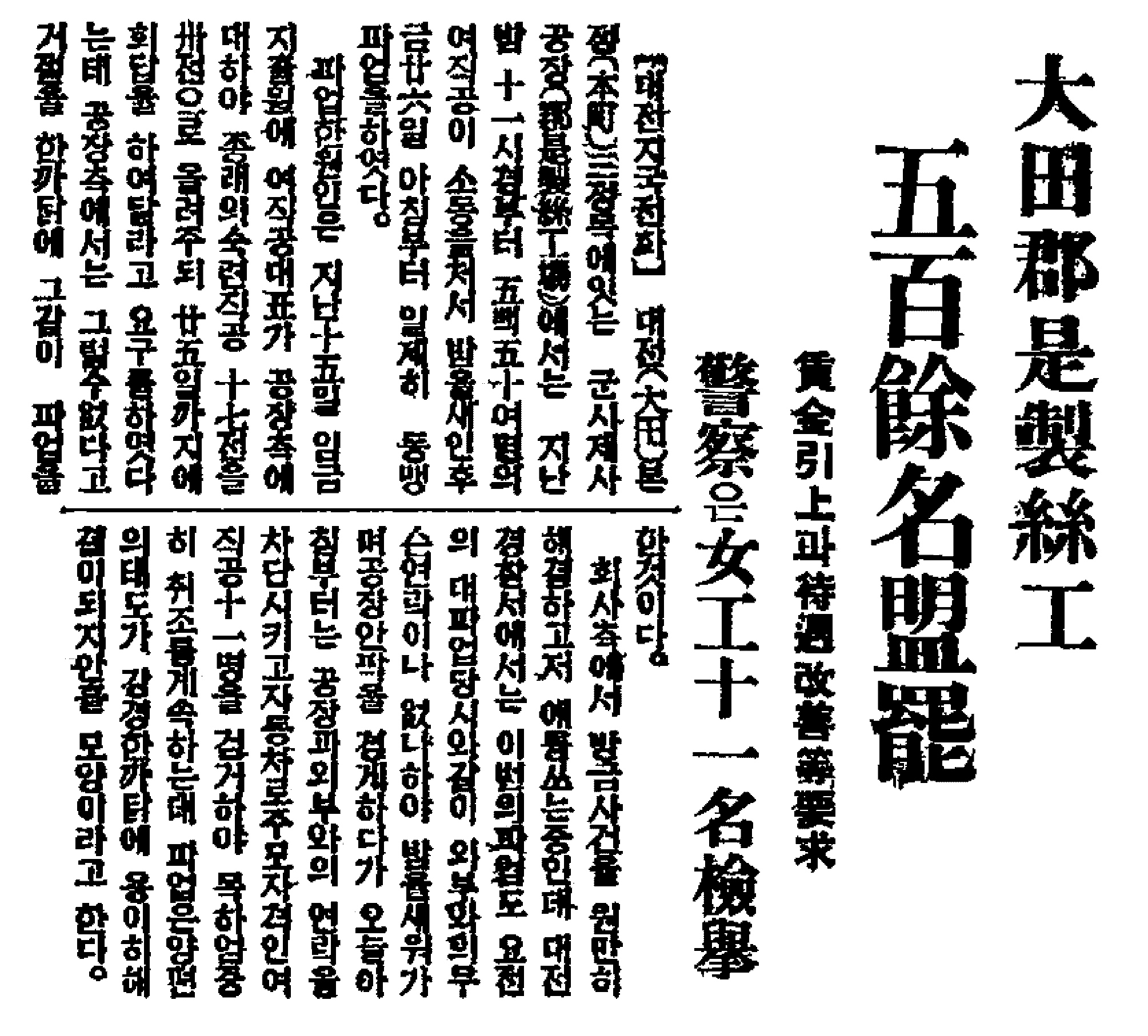 일제의 대표적 재벌인 미쯔비시[三井]가 세운 군시제사(郡是製絲) 대전공장은 1930년을 전후하여 충남지역을 경제적으로 지배하고 있었고, 그 과정에서 초과이윤을 극대화하기 위해 조선인 노동자들의 희생을 강요하고 있었다. 군시제사 대전공장 조선인 노동자들은 열악한 노동조건과 노동통제에 대해 세차례(1932.11.7~14, 1935.8.25~26, 1936.8.17~21)에 걸쳐 노동쟁의를 일으켰다. 군시제사 대전공장의 노동쟁의는 '조선인 노동자에 대한 차별대우, 임금인상, 가혹한 노동통제'가 원인이었다. 투쟁양상도 단순한 작업거부가 아니라 단식동맹파업, 가두진출, 경찰서 앞에서의 시위 등 적극적이었다. 군시제사 대전공장의 노동쟁의는 당시 고양된 노동자들의 반일의식을 토대로 조직적으로 전개되었으며, 대전지역 사회운동진영과 연합해 전개한 특징을 갖고 있다. |