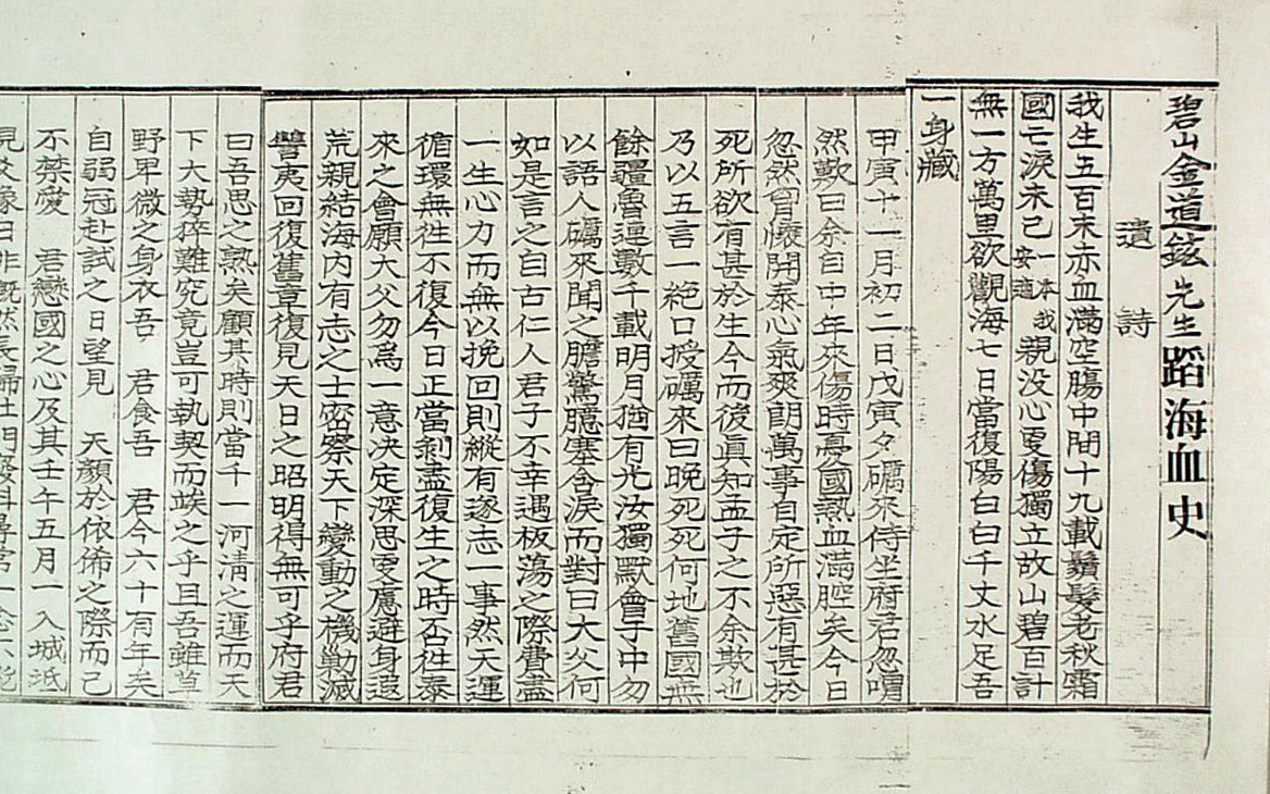 의병항쟁과 계몽운동으로 구국·항일의 의지를 펼치던 김도현은 대한제국이 무너지자 자결을 결심하였다. 그가 자정순국을 결행한데는 스승 이만도의 영향이 컸다. 김도현은 1896년 선성의진의 중군장으로 활약하면서 이만도와 사제의 인연을 맺었다. 스승의 단식투쟁을 지켜보던 김도현은 함께 자결을 결심하였으나 이만도는 만류하였다. 당시 김도현의 부친이 생존해 있었기 때문이다. 김도현은 그 뜻을 잠시 미루었다가 1914년 부친이 운명하고 상을 치른 뒤 자정순국의 의지를 결행하였다. 이는 자신의 육신을 적의 땅에 남겨둘 수 없다는 뜻이었다. 그가 선택한 길은 음독자살이나 단식이 아닌 도해(蹈海) 즉, 바다에 걸어 들어가 스스로 목숨을 끊는 순국이었다. 1914년 11월 7일 김도현은 절명시(絶命詩)를 남기고, 영해의 대진에서 바다 속으로 걸어 들어가 생을 마감하였다. |